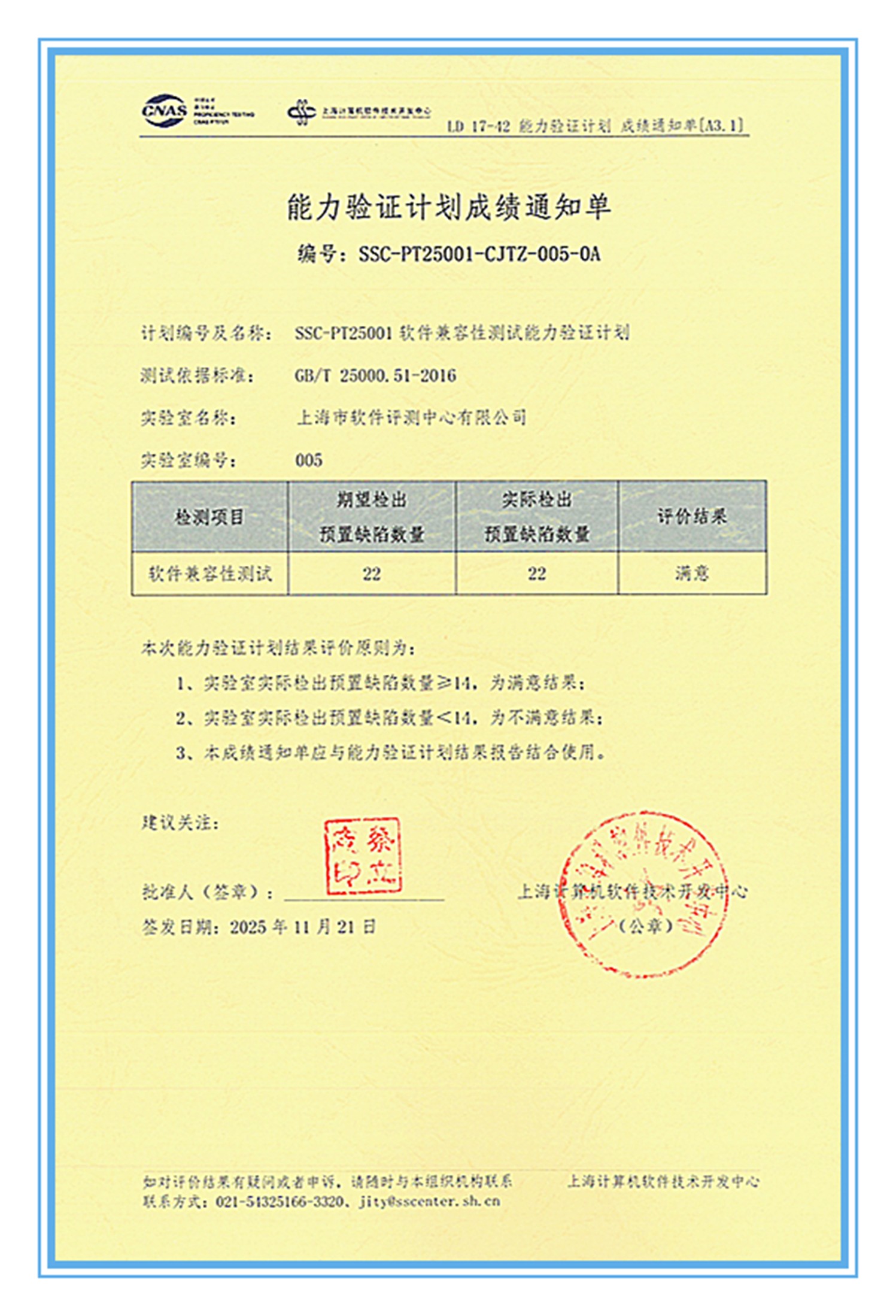 近日,上海市软件评测中心顺利通过由中国合格评定国家认可委员会(CNAS)授权组织实施的SSC-PT25001软件兼容性测试能力验证计划,以满分的成绩荣获“满意”评价,再次彰显了评测中心在软件兼容性测试领域的顶尖水准与行业公信力。