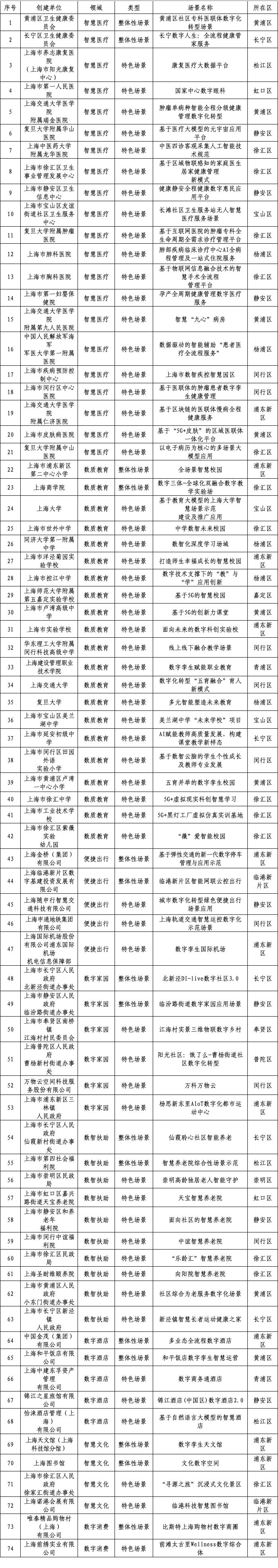 在本市健康、成长、颐养、扶助、出行、文旅、购物、家园等生活领域,培育孵化一批具有整体性、代表性数字化转型的示范创建单位,承担示范性场景建设任务,以“揭榜挂帅”形式打造重点场景标杆,形成标杆引领和示范效应。前期参与申报《上海市经济信息化委关于组织开展城市数字化转型重点场景示范任务(生活领域)揭榜挂帅工作的通知》(沪经信推〔2023〕466号)的单位,综合考虑行业代表性、场景建设特色等,经行业主管部门和专家评审通过后,作为第一批城市数字化转型(生活领域)揭榜挂帅场景示范创建单位(详见附件),15个项目单位作为整体性场景示范创建单位,59个项目单位作为特色场景示范创建单位。