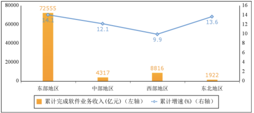 中、西部地区软件业务收入小幅回落,东部地区增势突出。前三季度,东部地区完成软件业务收入72555亿元,同比增长14.1%,增速较1—8月份提高0.1个百分点;中部地区完成软件业务收入4317亿元,同比增长12.1%,增速较1—8月份回落1个百分点;西部地区完成软件业务收入8816亿元,同比增长9.9%,增速较1—8月份回落0.2个百分点;东北地区完成软件业务收入1922亿元,同比增长13.6%,增速较1—8月份提高0.3个百分点。四个地区软件业务收入占全国比重分别为82.8%、4.9%、10.1%和2.2%。